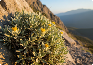 A lush bush of mountain tea with vibrant yellow flowers thrives on a rocky slope, basking in the warm glow of the setting sun against a backdrop of distant hills.