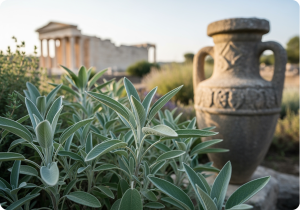 Greek sage plants thrive in the foreground, framed by an ancient amphora and the hazy outline of classical Greek ruins in the background.