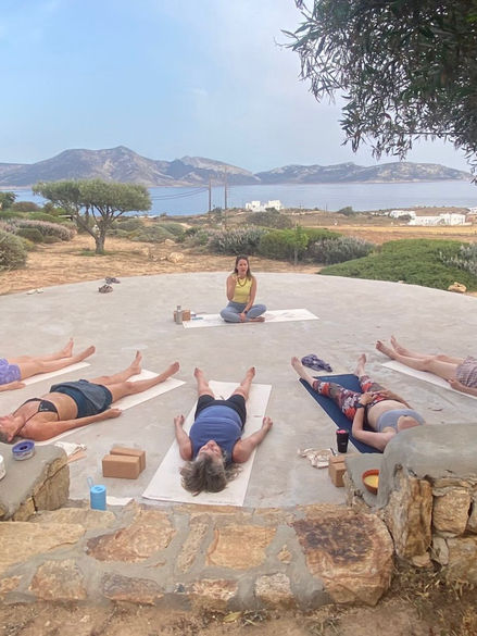 Evenings are for deep relaxation, featuring yin/restorative yoga and guided yoga nidra, followed by dinner at a local taverna or the villa.